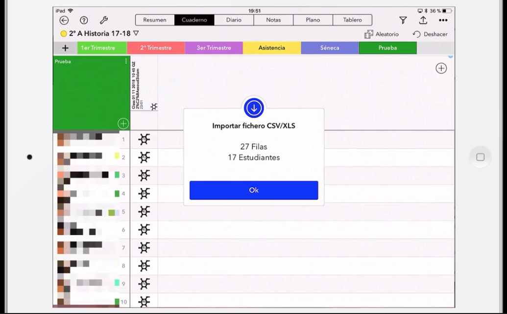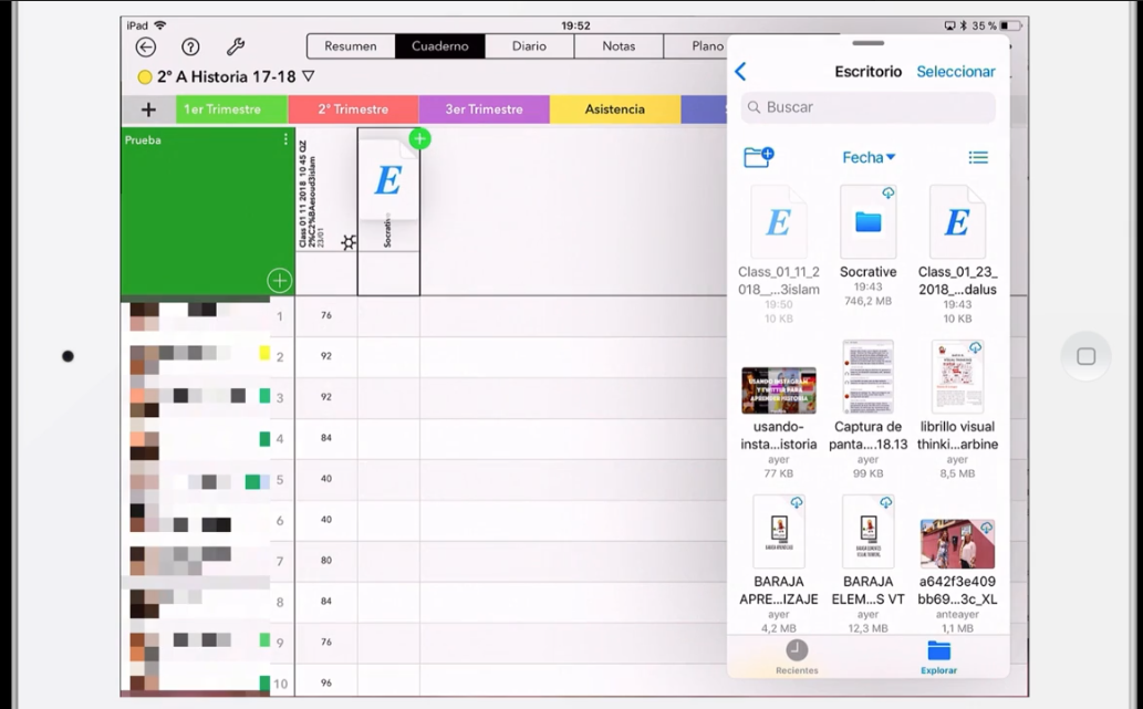 Cuando nos llega este email, lo que hacemos es coger la hoja de cálculo y pasarla a Archivos del iPad. Ahora gracias a iOS 11 y la función de Drag & Drop compatible con iDoceo, podemos simplemente coger el archivo de la hoja de cálculo, y arrastrarla hacia una columna de iDoceo. Automáticamente te aparecerán las notas asignadas a cada alumno/a en su casilla correspondiente.
