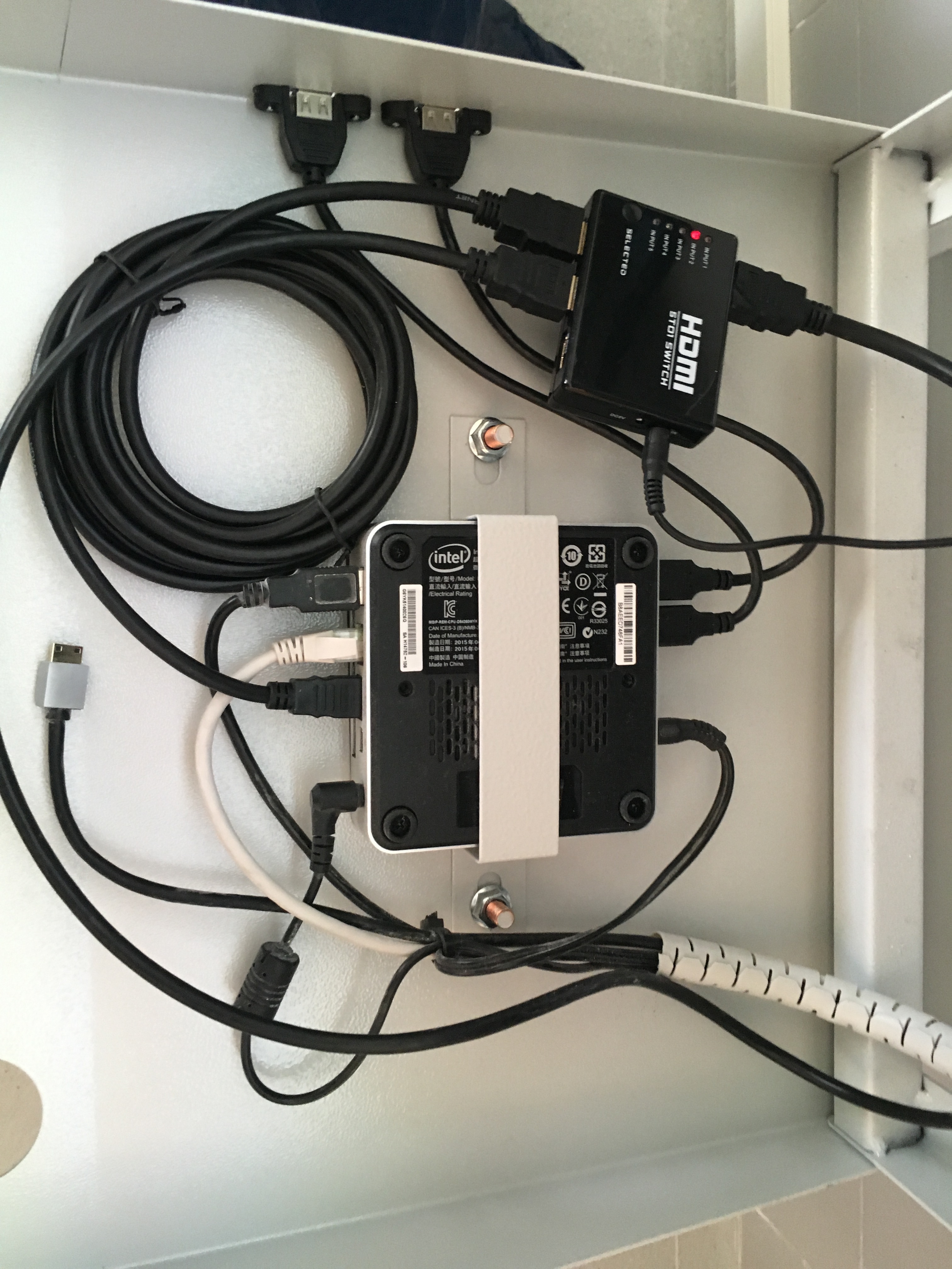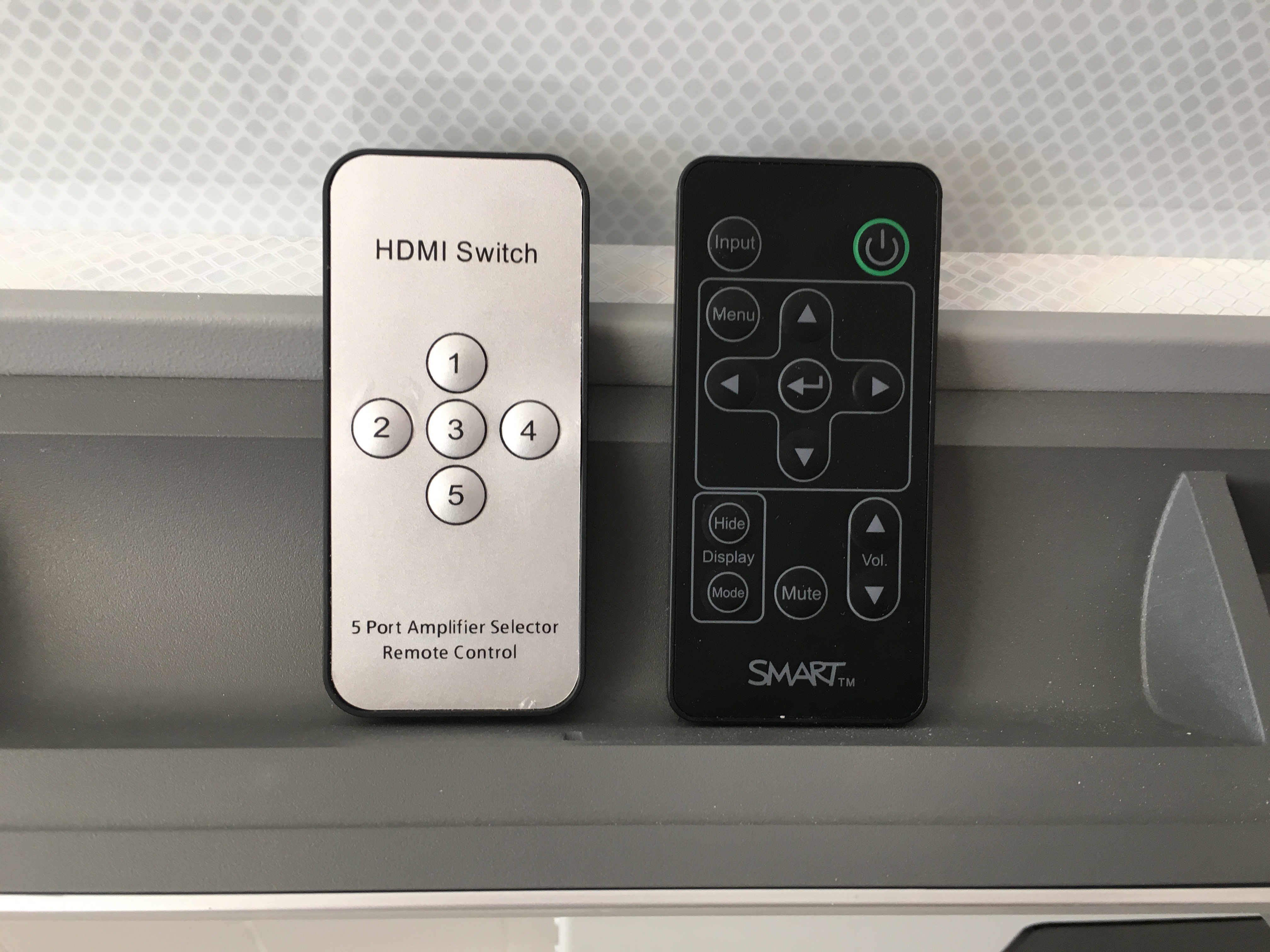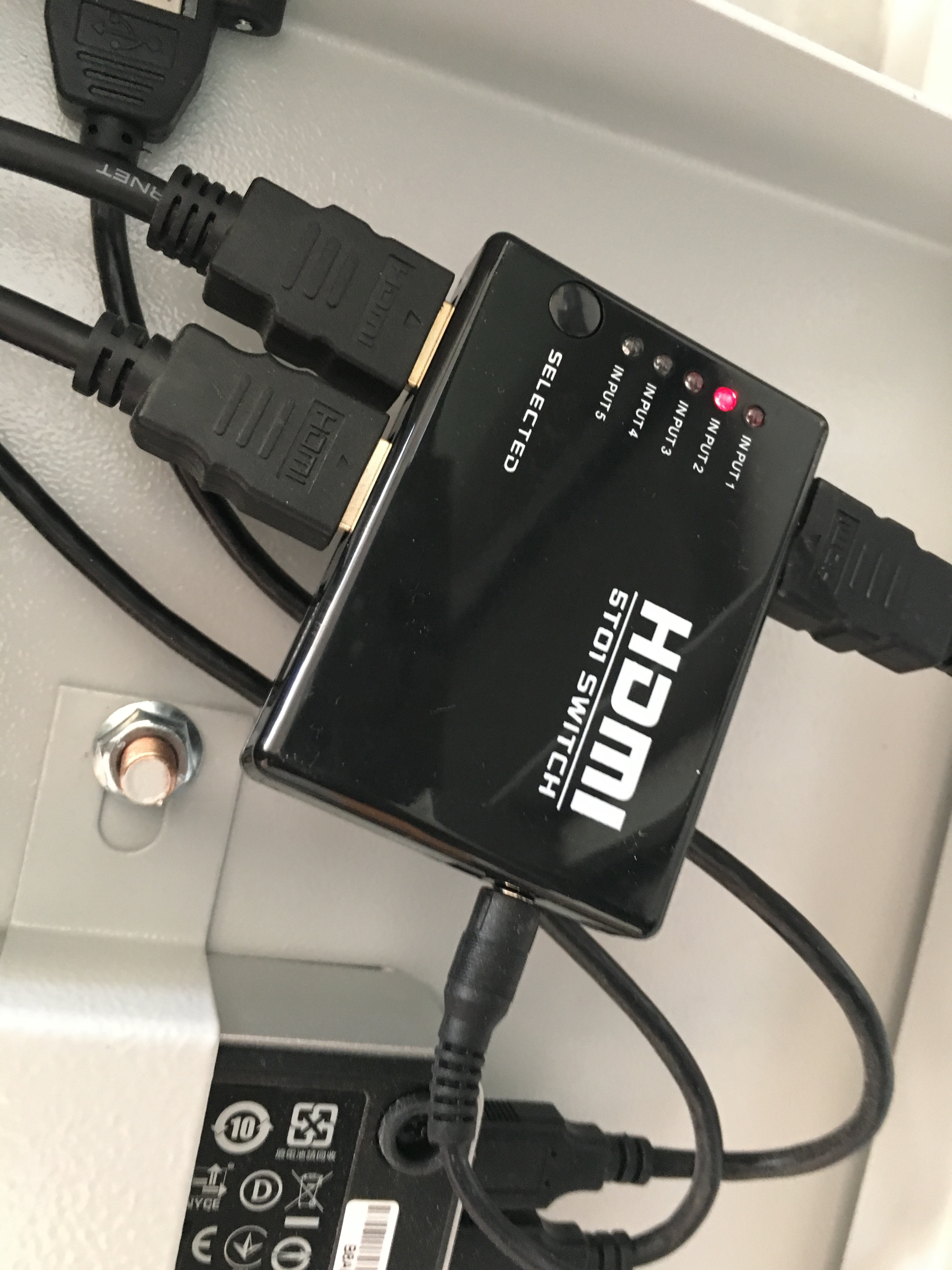 La parte más complicada vino con el HDMI, ya que el único que hay, está siendo usado por el ordenador que lleva el software de la pizarra digital. Así que la solución fue otra: compramos un conmutador de HDMI, conectamos en el HDMI 1 el ordenador, y en el HDMI 2 el HDMI que iría a la caja de al lado de la mesa del profesor. El conmutador tiene un mando a distancia, que dependiendo del HDMI que quieras utilizar, pulsas 1 o 2 y se irá a la PDI o al iPad respectivamente. Todo ello lo cableamos y el detector de infrarrojos del mando a distancia del conmutador de HDMI lo montamos en el lateral de la PDI sin que se viera apenas.