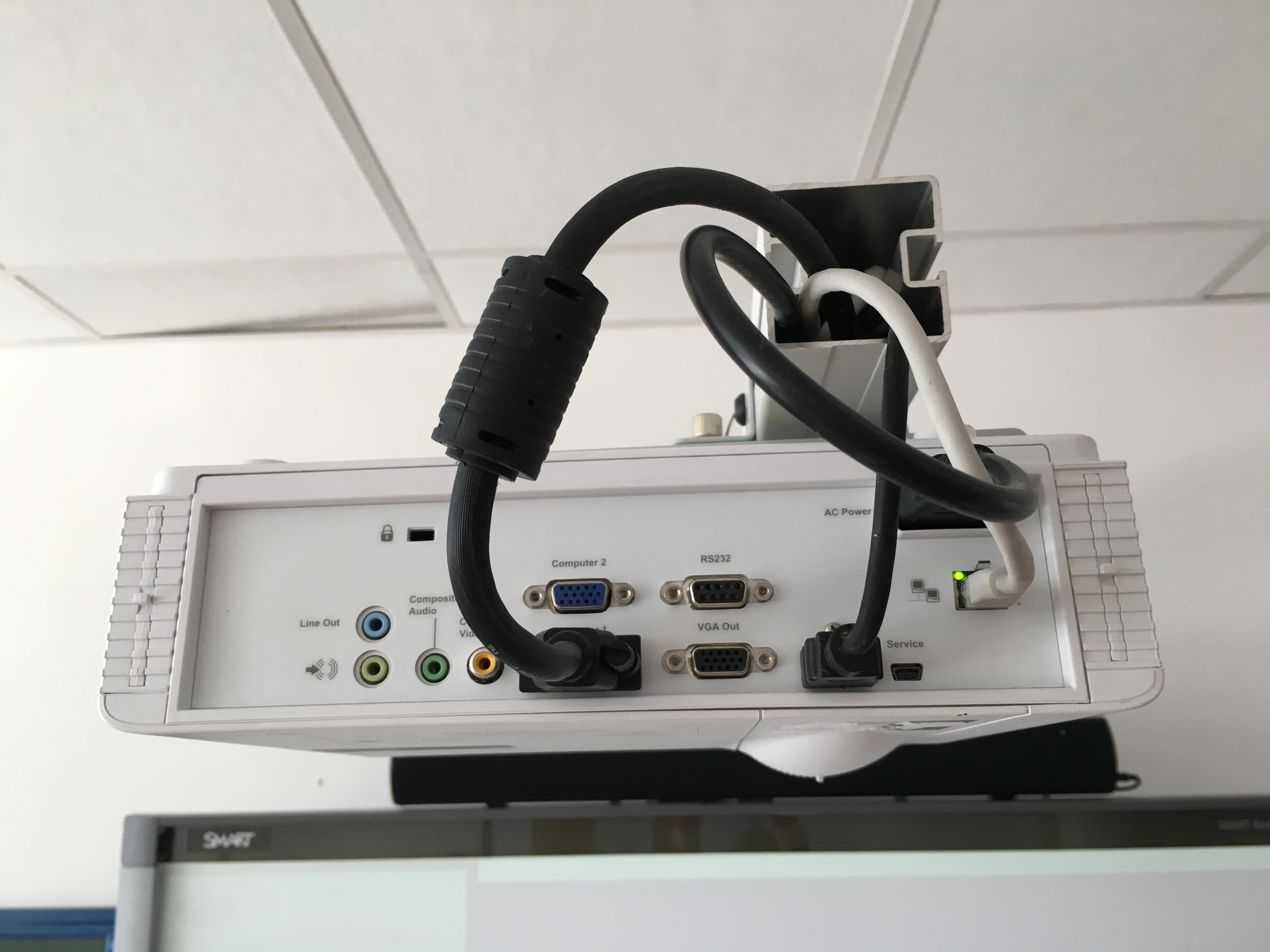 En el caso de las nuevas PDI que estamos recibiendo, hay un problema, y es que el ordenador de la PDI viene incorporado debajo de la PDI y está enganchado a una salida única HDMI que hay en el proyector. En el caso del profesorado de mi centro, hay profesores que tienen el conector VGA, y otros que tienen el HDMI, así que tuve que buscar la solución para enganchar con ambos conectores a la PDI. Pues bien, lo primero que vi es que la salida VGA del proyector no estaba usada, así que compramos 10 metros de cable VGA, que enganchamos al proyector, pasamos por el tubo de la PDI, y luego cableamos hasta la pared más cerca a la mesa del profesor, colocando Ángel ahí una caja donde poder conectar el cable VGA el profesor con su adaptador.