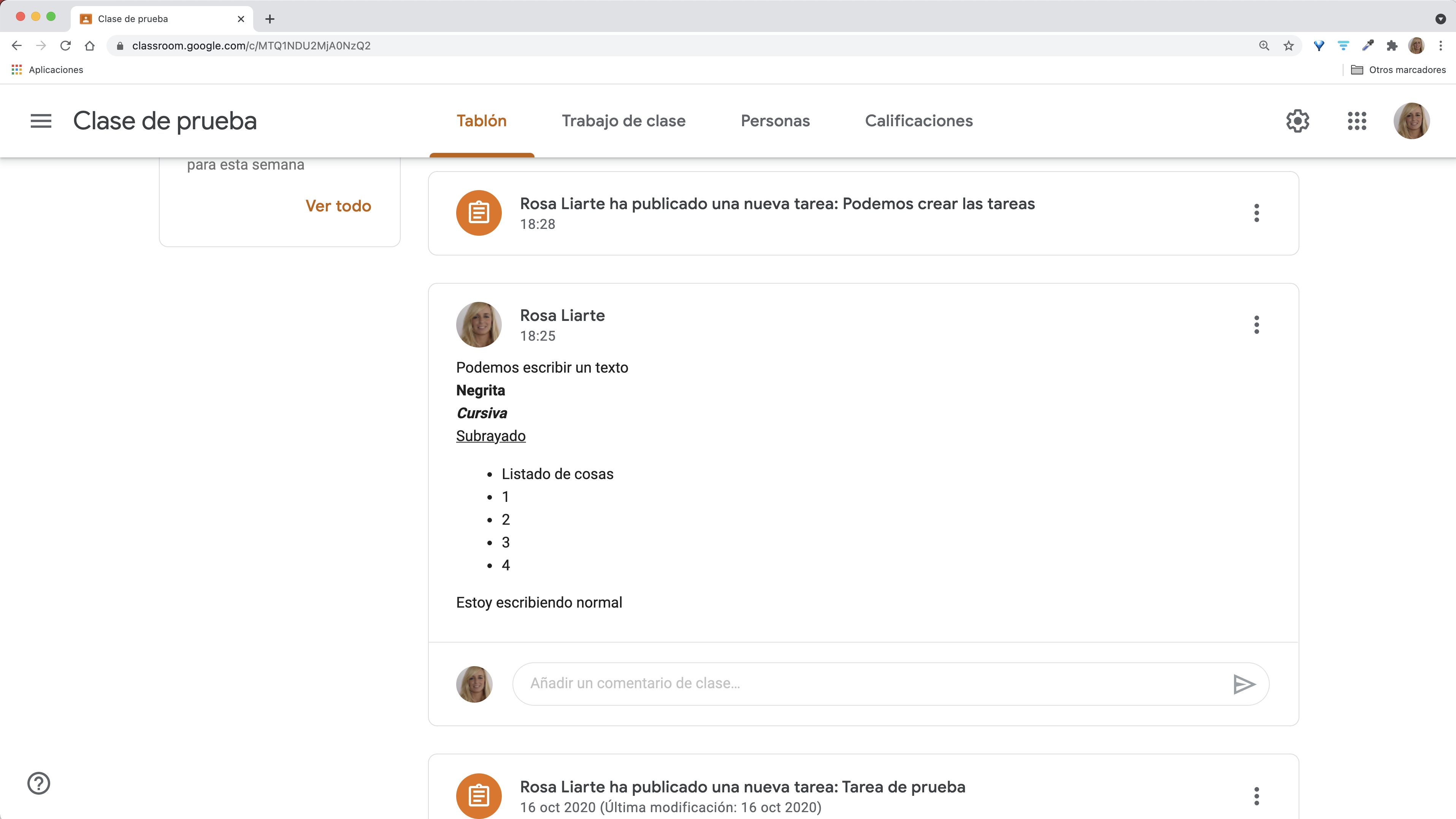 El texto enriquecido lo vamos a tener desde ya tanto cuando escribamos en el tablón, como cuando escribamos en trabajo de clase. La verdad que la opción de listas es muy interesante y ayudará a poder redactar mejor los mensajes a nuestro alumnado o las tareas que asignemos. ¡Estoy súper contenta de que ya esté esta función!.