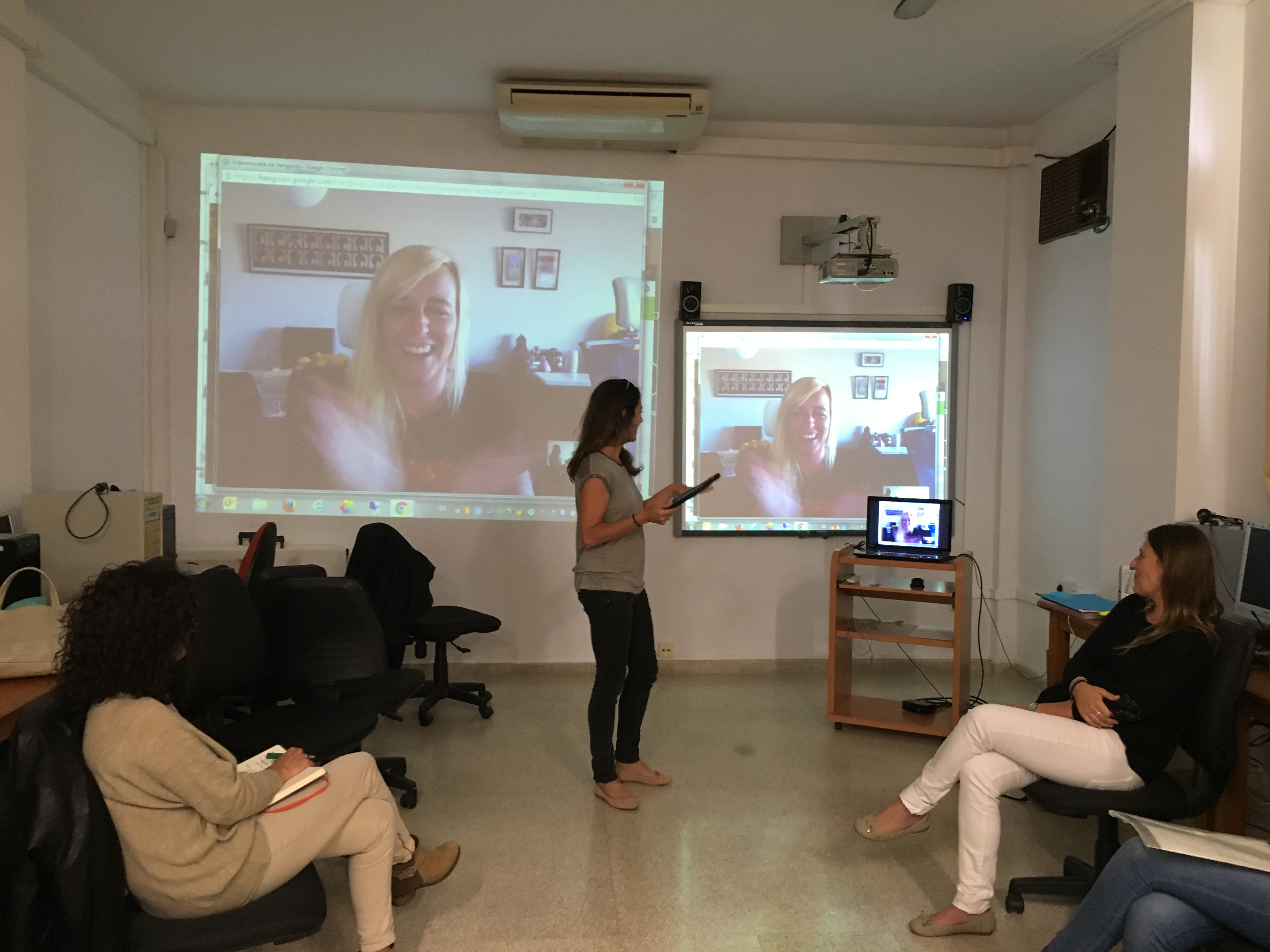 Comenzamos el Hangout con el profesorado desde el CEP de Manacor, y de verdad os digo, ha sido la mejor experiencia que he tenido. En este mes desde la sesión hasta que nos hemos visto por Hangout, el profesorado ha podido invertir su clase, ha probado apps, y pude ver cómo había dado resultado mi curso. Algunos de ellos no paraban de dar las gracias, pero yo también se las daba a ellos por arrancarme una sonrisa tan grande ese día y mostrarme que de verdad se pueden cambiar las cosas si se quiere, solamente es cuestión de actitud, como tanto repito en mis ponencias.