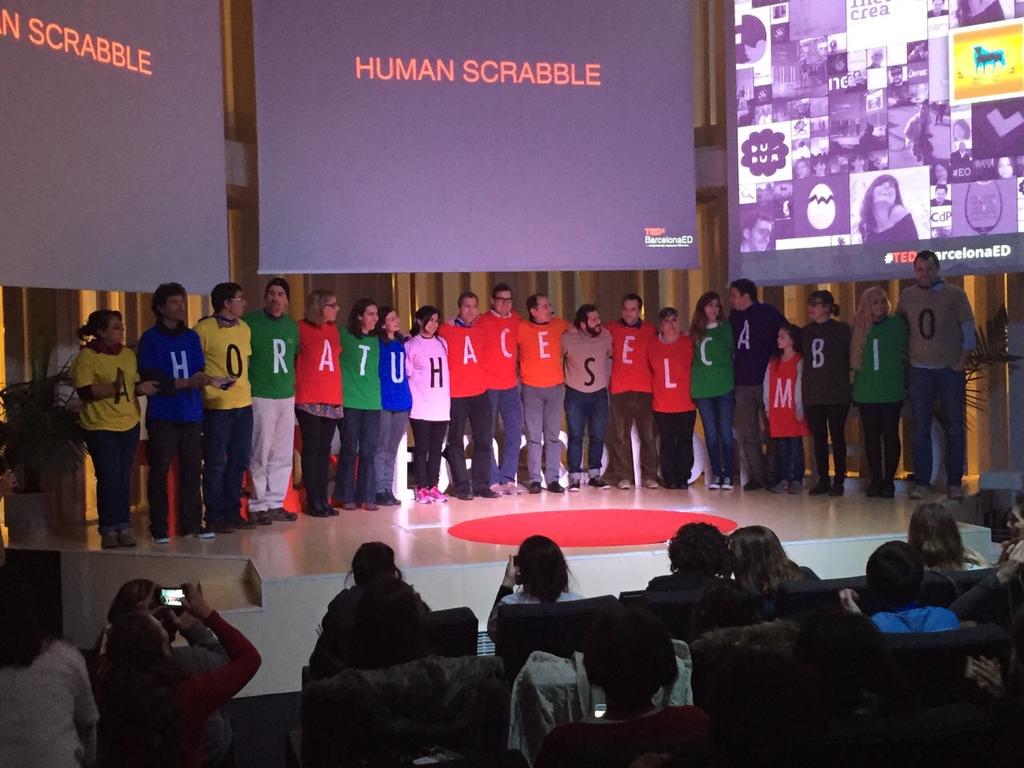 Continuaron las charlas de la tarde, donde me quedo sobre todo con la de María Acaso y sus 5 microrevoluciones, donde como recoge en su libro, termina pidiendo al profesorado que «paremos la farsa» en la educación. Tras ello, llamó a subir al escenario a un Scrabble humano, ahí estaba la identificación de nuestras camisetas, donde me tocó ser la I de la frase «Ahora tú haces el cambio».