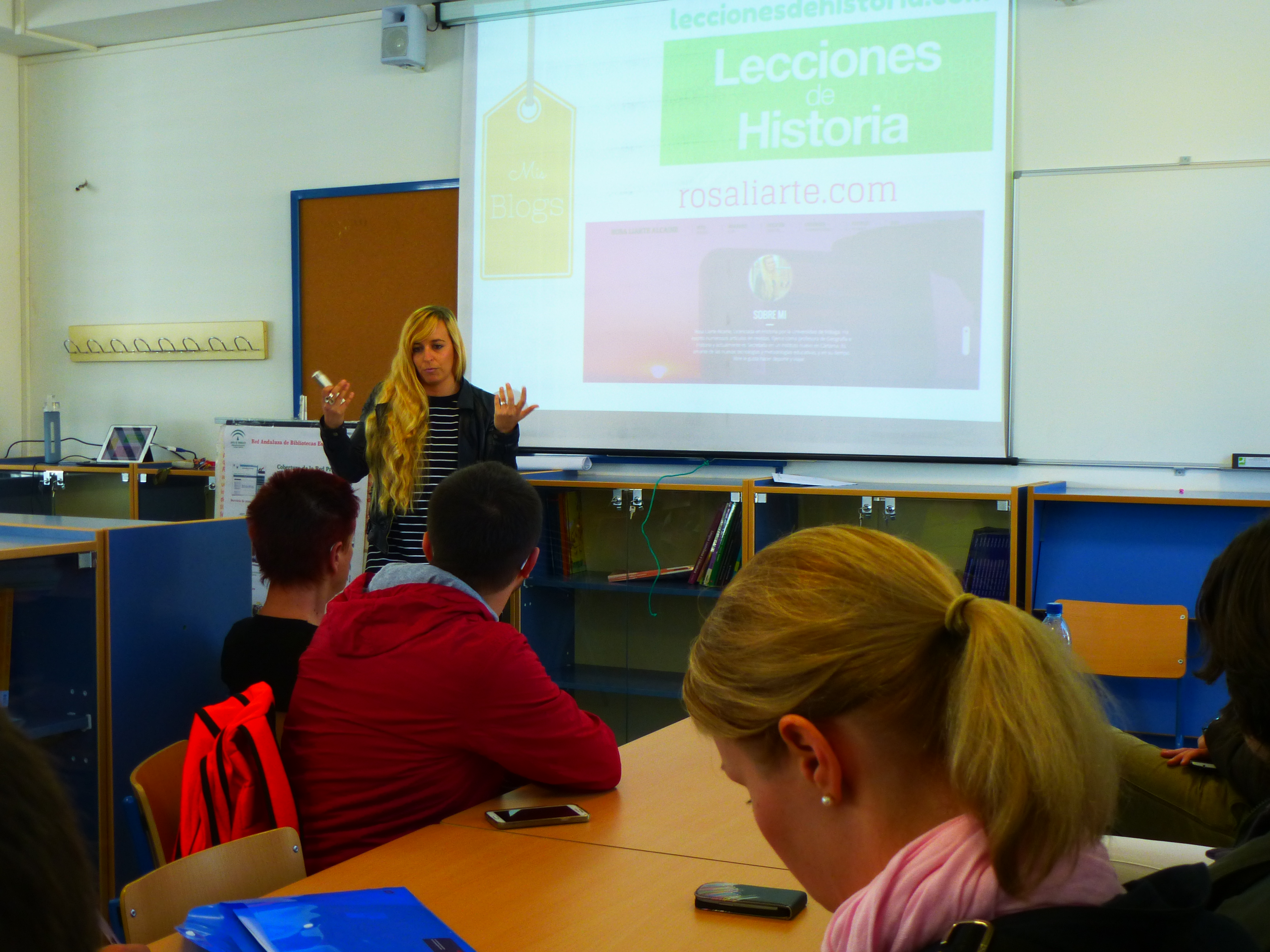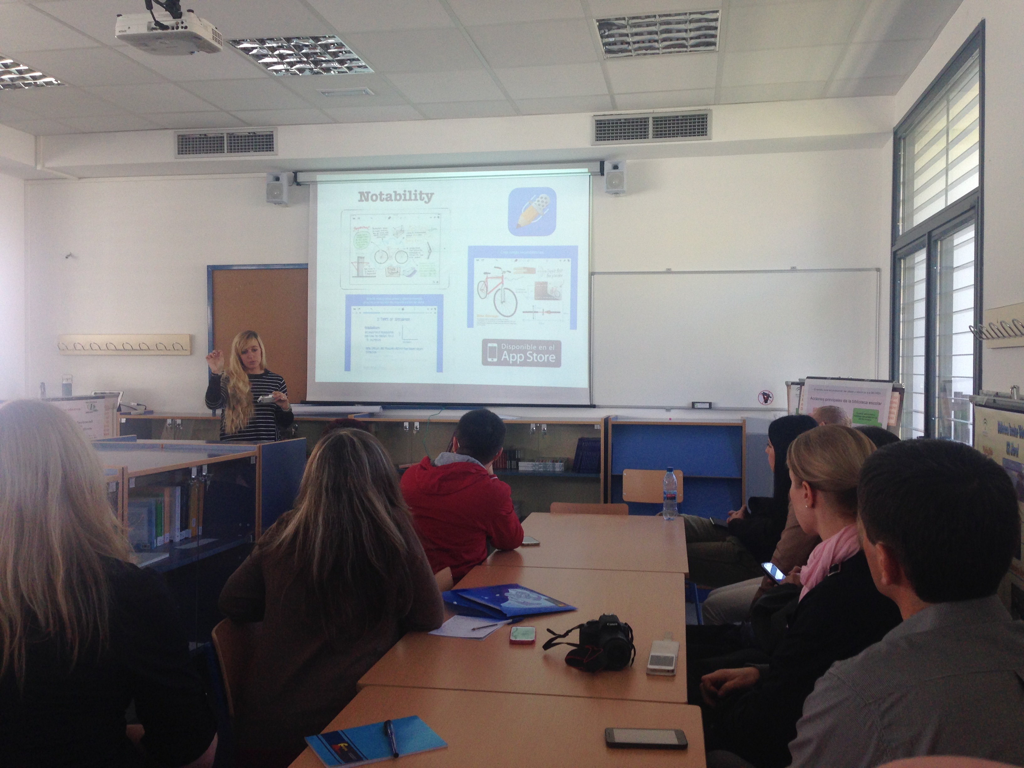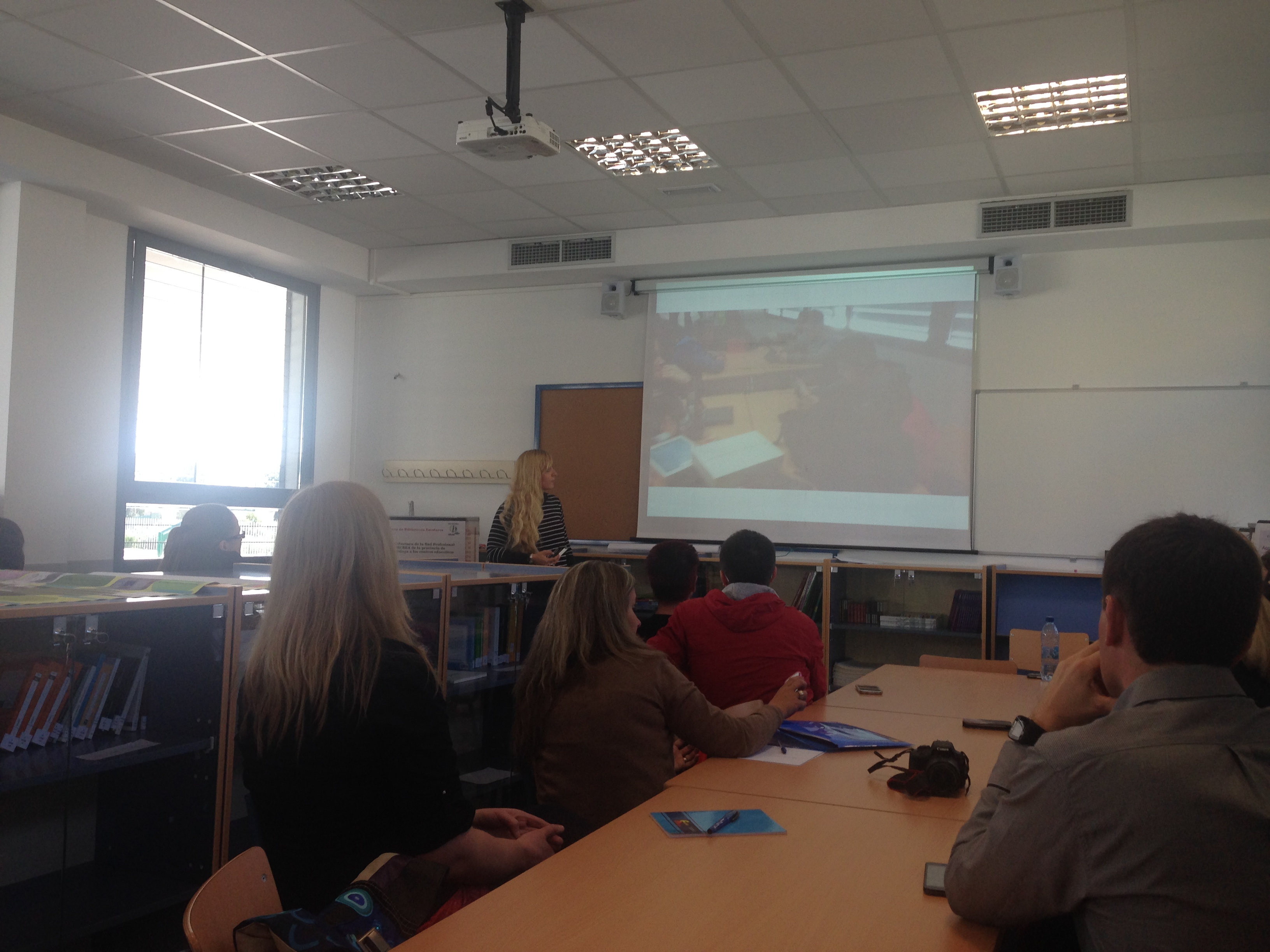 La propuesta que me hacía Eduardo era la siguiente: una visita al centro, entrar a algunas aulas a ver cómo trabaja el profesorado y el alumnado. Compartir con el profesorado nuestro proyecto de centro, y tras ello, como colofón final, les daría yo misma una charla sobre cómo trabajo en clase la metodología ABP y Flipped Classroom con dispositivos móviles, estaban muy interesados en ello, y más aún por ser un centro público de reciente creación. Está claro, que me preparé todo ello con muchísimas ganas, y bastante nerviosa por cierto, la charla de hora y media de duración, la tenía que dar al completo en inglés.