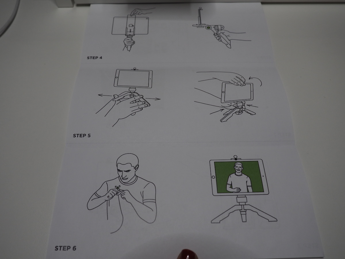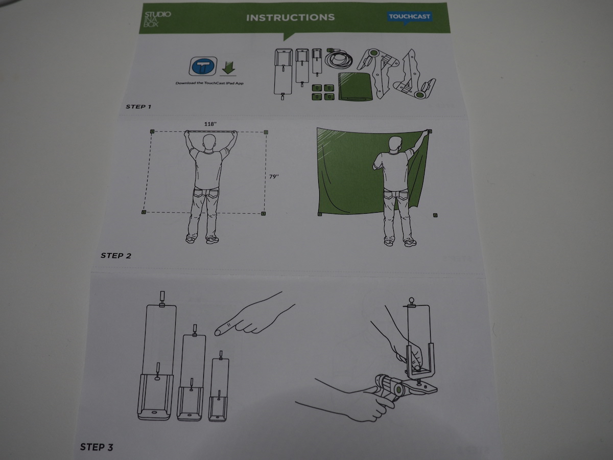 Se trata de una caja grande verde que incluye en su interior un Chroma Key verde para colgar en cualquier pared, con 4 ganchos de plástico adhesivos, que se pueden meter en unas arandelas que trae ya la tela. Además incluye 2 trípodes de mano que se pueden ampliar las patas y dejarlos puestos en una mesa. Tres enganchas de diferentes tamaños tanto para iPad como para iPhone, y finalmente trae también un micrófono pequeño que se puede agarrar con pinza, tal y como se usan en la tele. El micrófono se inserta en la parte donde se ponen los cascos en el iPad o en el iPhone, ya que tienen una salida auxiliar.